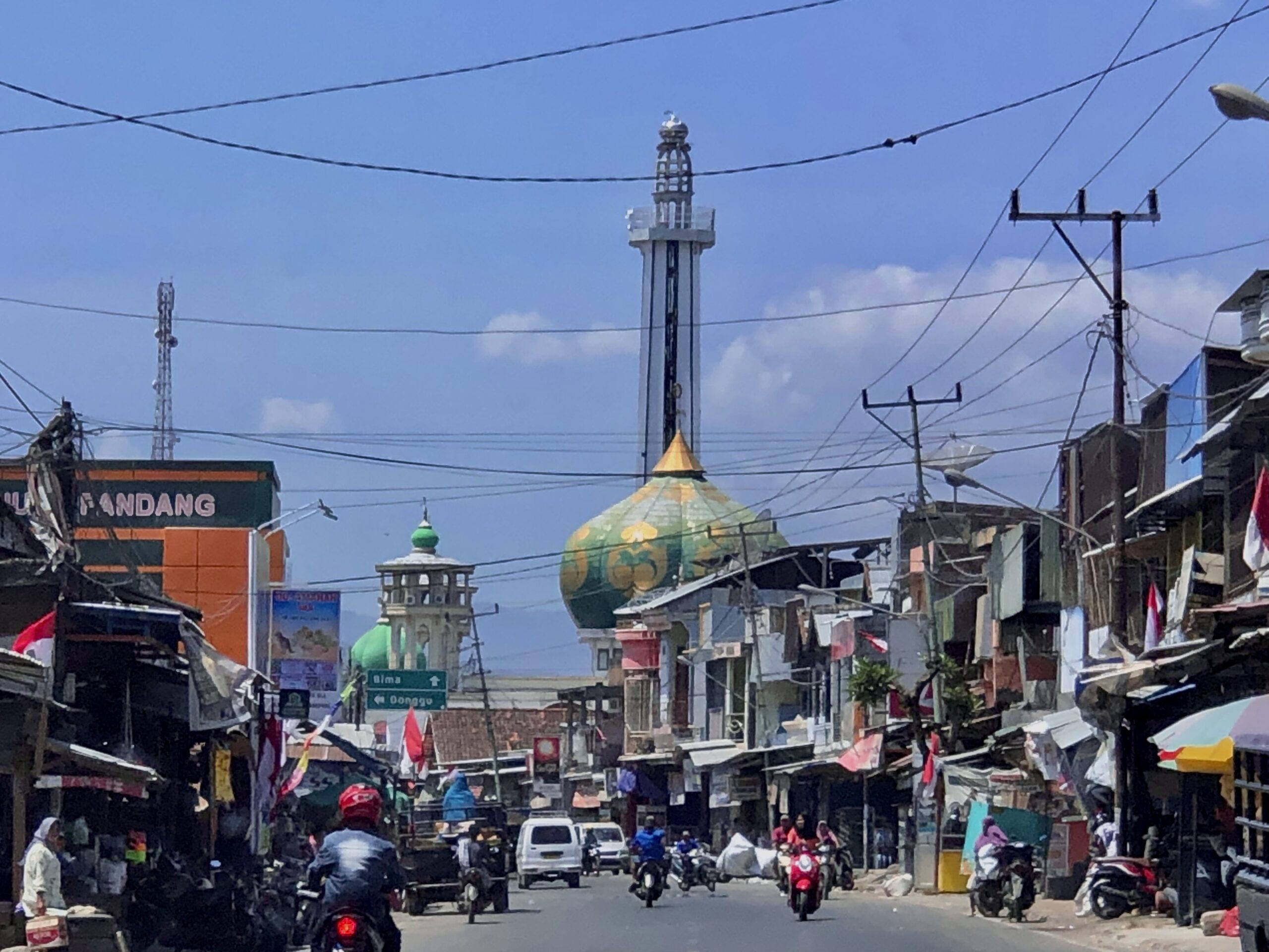 Die Orte die wir durchfahren sind meist kleine Dörfer , wo die Zeit stehen geblieben zu sein scheint. Ziegen, Kühe und Hühner sind neben und auf der Strasse, Hunde lungern überall rum. Die Dörfer bestehen zumeist aus Hütten mit Wellblechdächern, es sieht sehr ärmlich aus und auch hier liegt überall der Müll herum. Immer wieder riecht es stark nach verbrannter Plastik mit entsprechender Rauchentwicklung, Müllverbrennung auf indonesisch…Es hat den Anschein, als durchfahren wir das 19.Jahrhundert. In Gegenden mit mehr Grün mal etwas Abwechslung, dutzende von Affen , eine Art der Makaken sitzen an der Strasse und wühlen im Müll, der auch hier links und rechts der Strasse verteilt ist. Ich sitze während er ganzen Fahrt vorn, der Rest der Mannschaft zu dritt hinten auf dem Rücksitz. Der SUV ist relativ groß und ich versuche es mir vorn einigermaßen bequem zu machen. Der Fahrer ist wie die meisten Einheimischen sehr freundlich, spricht aber nicht sehr viel, was mir ganz recht ist. Irgendwann schlafe ich von dem ganzen Geschunkle ein. Ich wache auf, als wir in eine Stadt einfahren. Bima.