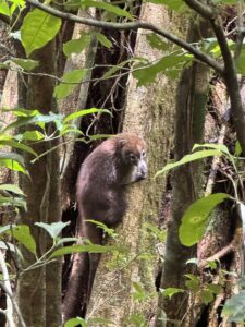 Im Gänsemarsch trappeln wir Alex hinterher bis wir im Dschungel sind. Es ist schwül-warm und anders als ich vermutet habe total still.Alex erzählt viel über die Flora und Fauna und macht das auf eine witzige Art und Weise, die mir gut gefällt. Im Unterholz und an den Bäumen knackt es und wir können Dank Alex einen Kinkajou sehen. Dann gehievte immer tiefer rein in den Dschungel und Alex mahnt uns aufzupassen, da es mitunter steil bergab geht und nur ab und zu Halteseile angebracht sind. Auf Geheiß von Alex machen wir das Licht der Taschenlampen aus und sollen mali innehalten um den Dschungel wirken zu lassen.Eine tolle Erfahrung, dann weist Alex darauf hin, dass es hier giftige Skorpione gibt,